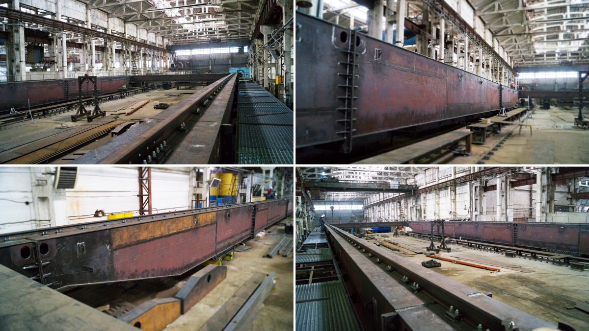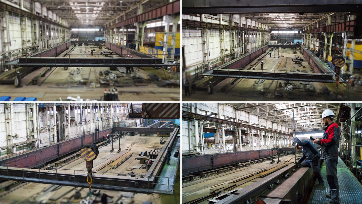 Этап стапельной сборки двухбалочного контейнерного козлового крана, проверка качества сварных швов и геометрии галереи крана.